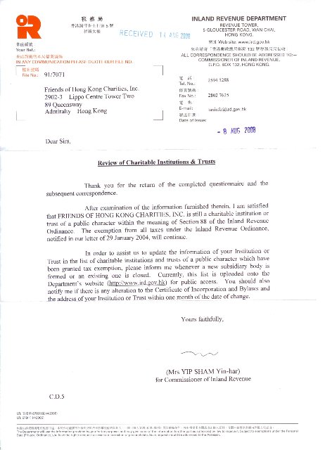 Friends of Hong Kong Charities approved as charitable by the Inland Revenue Department under Section 88 of the Inland Revenue Ordinance.